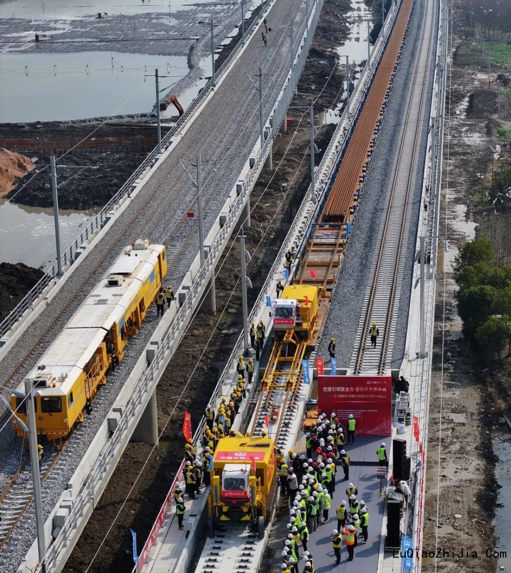 长三角铁路消息:3月2日10时18分,在上海市松江区沪苏湖铁路施工现场,随着首对500米长钢轨被铺轨机平稳、精准地铺设到无砟轨道床上,标志着沪苏湖铁路开始全线铺轨。